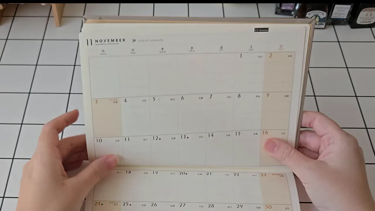 しおりが付いていない手帳では、さっと目的ページを開くための工夫が必要です。そこで見つけたのがPINE BOOKのインデックスカレンダーシール。カレンダー付きで曜日確認も手早くできます。