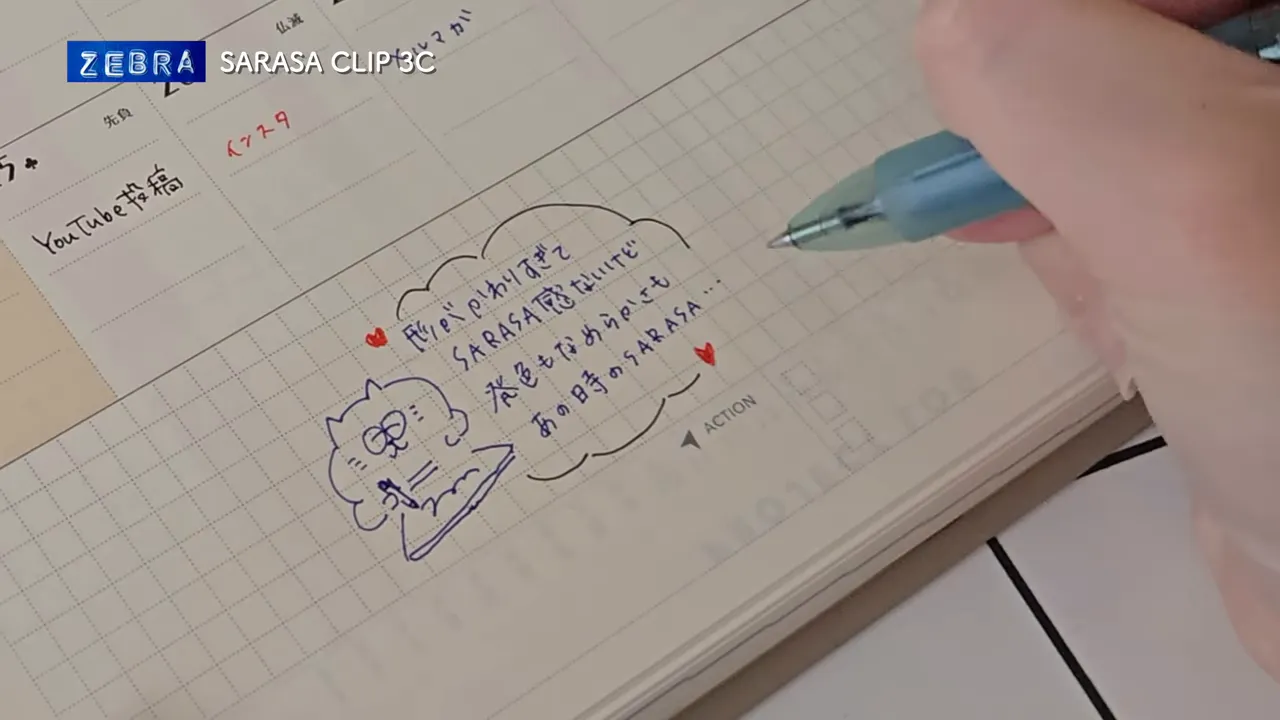 SARASAのゲルインクはとにかく滑らか。過去にはインクがたっぷり出てしまい擦って伸ばしてしまう失敗もありましたが、この3Cは線も意外と細く出も安定していて、手帳の方眼ページにアイデアや図を描き込むのに向いています。ノスタルジーも手伝って、色を選びながらノート作りを楽しむ気持ちが蘇りました。