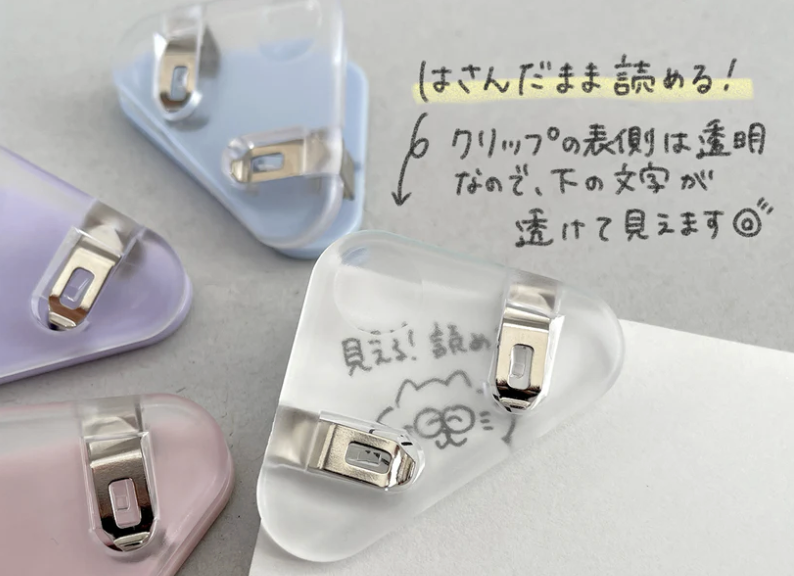 裏面は透明ななので、はさんだまま下の文字を読むことができます。ノートやメモ帳のしおり代わりにも使えて、外出先での書類整理やちょっとしたマーキングに便利です。