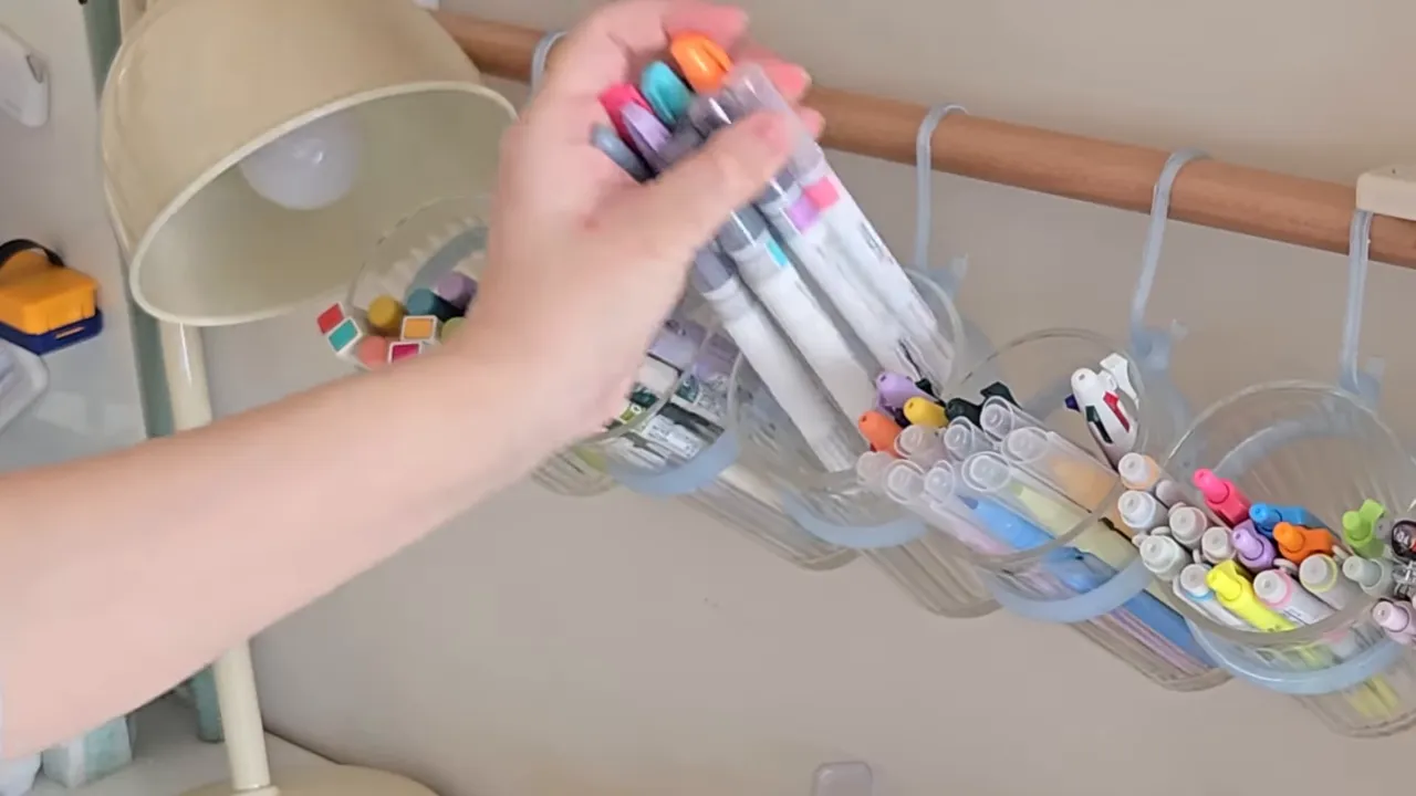 壁掛けペン収納で、ガラスコップに入った色とりどりのペンが見渡せる様子