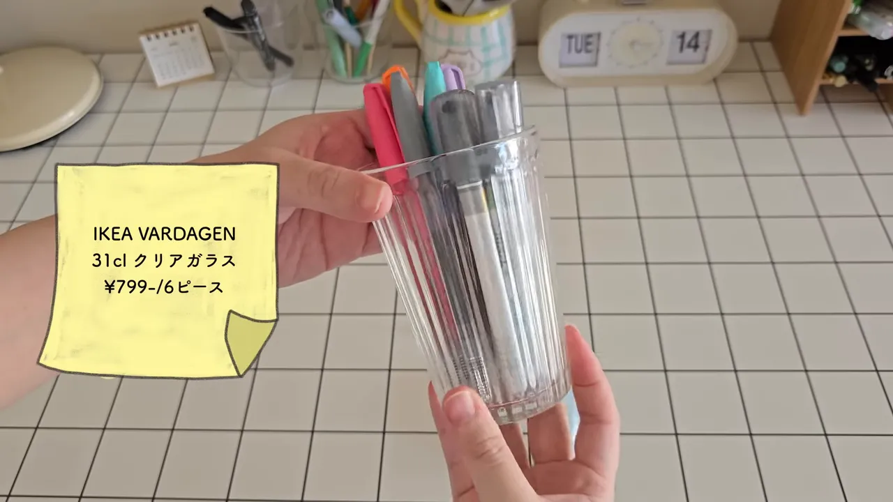 使っているのはIKEAの小さめのコップ。しっかりした印象があって、中身が見やすく、短めのペンでもちゃんと自立してくれそうだなと思って選びました。