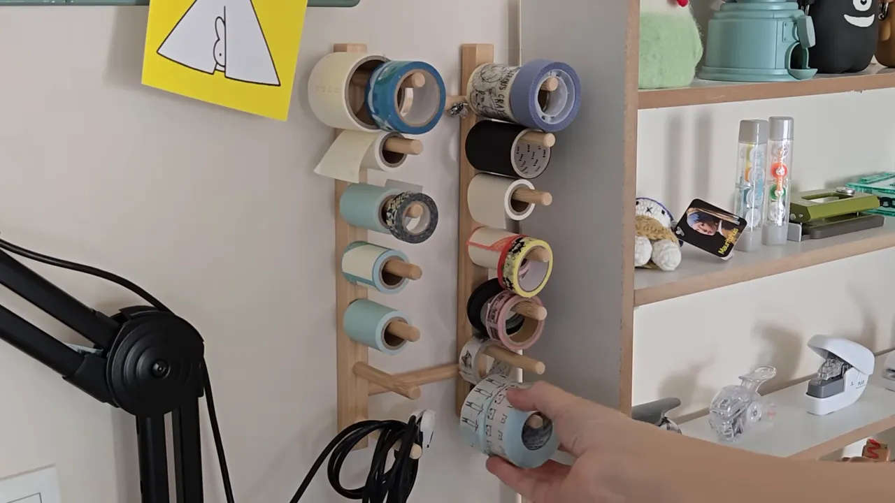 ノート以外にもマスキングテープやロールタイプの付箋の収納に使っています。こういうロール状のものって、箱に入れると埋もれるし、平置きすると場所を取るので、立体的に壁面を使えるのが便利です。