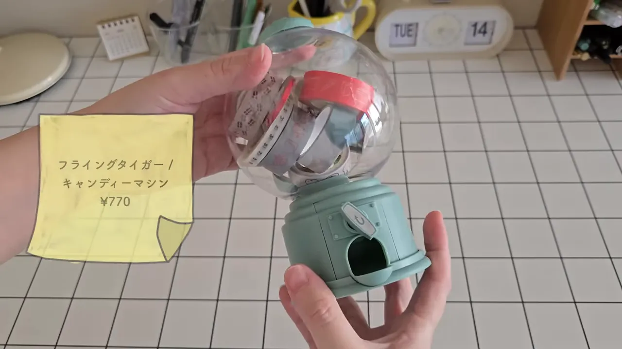 棚の上には、フライングタイガーで買ったキャンディーマシーンも置いています。もともとは小さなキャンディーを入れて回すと出てくるものらしいのですが、私は上の部分に使用頻度の低いマスキングテープをぎゅうぎゅうに詰めているので、もはや回しても出てきません。