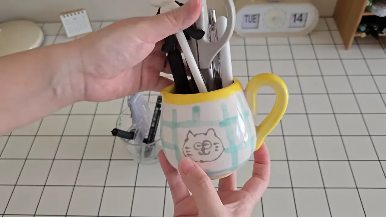 今まで文房具屋をいろいろと巡ってみて、ペンの収納はコップに入れるとおしゃれだなぁと思っていたので、それを家で再現できて満足の収納です。