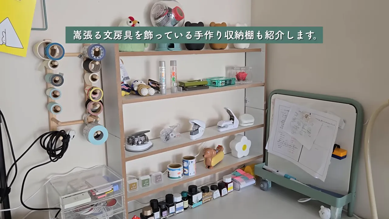 文房具って、そもそもひとつひとつがかわいいものが多いので、しまい込むよりお店みたいに並べたくなるんですよね。そんな気持ちで、見せる収納として使っています。