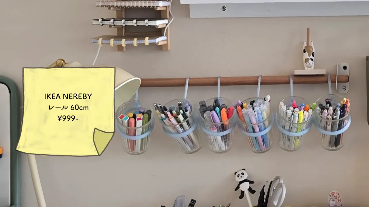 これはPinterestで見つけた収納アイディアを参考にしながら、IKEAで買ったアイテムと、自作したパーツを組み合わせて作ったもの。座った状態でもペンのデザインが見えるので、「あのペン使いたいな」というときにすぐに見つけられてとても便利です。