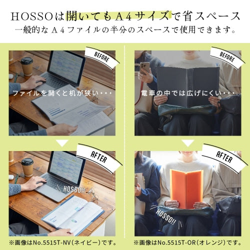 ①商品要約 「HOSSO(ホッソ)」は、横幅1/2で「スリム」に使えるファイルシリーズです。開いてもA4サイズなので、デスクや電車など限られた狭いスペースでも快適に使えます。閉じるとスリムになり、持ち運びにも便利です。