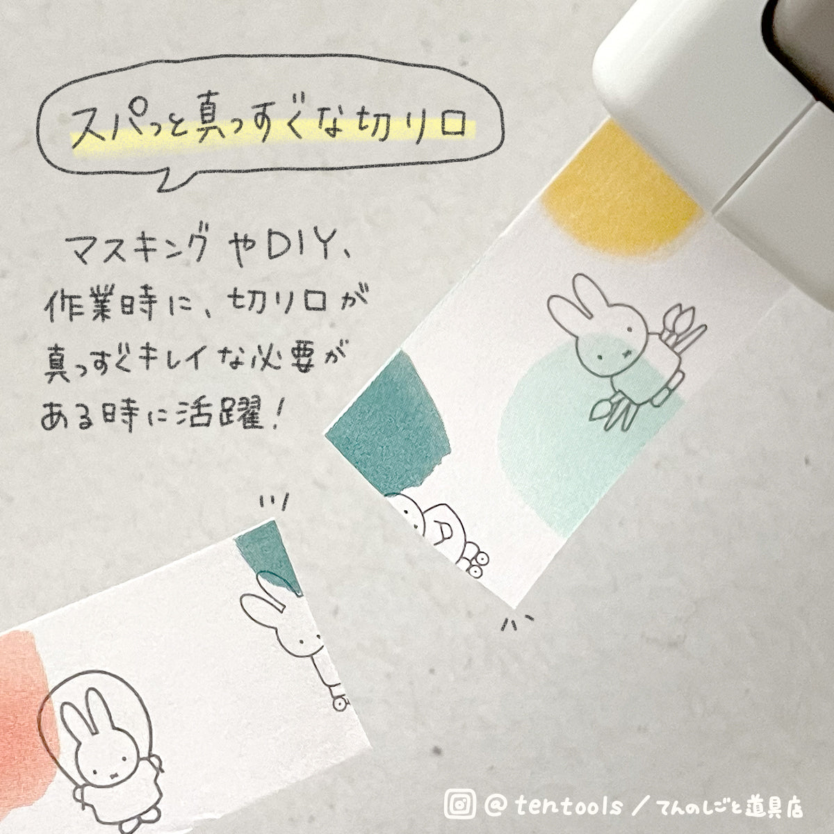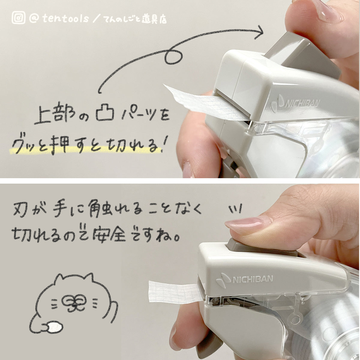 刃に触れずにテープを切ることができるので安全です。カットされたテープの切り口はギザギザのないまっすぐな仕上がりです。透明カバーでテープ残量がわかりやすく、テープが汚れにくいです。手のひらサイズでコンパクトなので、持ち運びにも便利です。