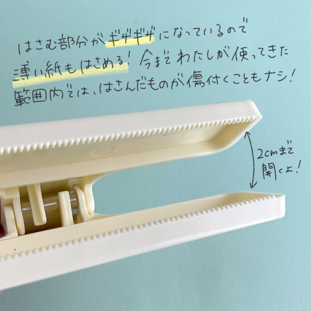 The pinching part is jagged, so you can pinch thin paper such as receipts. It's jagged, but in the range I've used it so far, it hasn't left any marks or scratches on anything I've pinched it with.