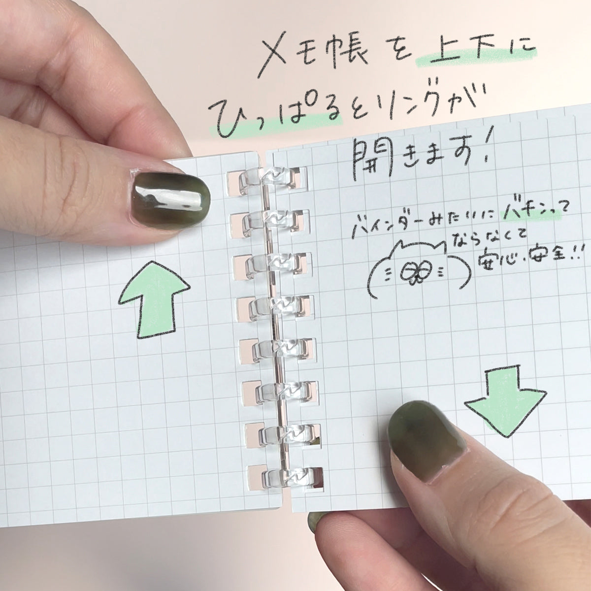 Gently pull the leaf near the ring diagonally up and down to open the binding. It can be opened with light force without recoil, so there is no risk of getting your hands caught like with binders.