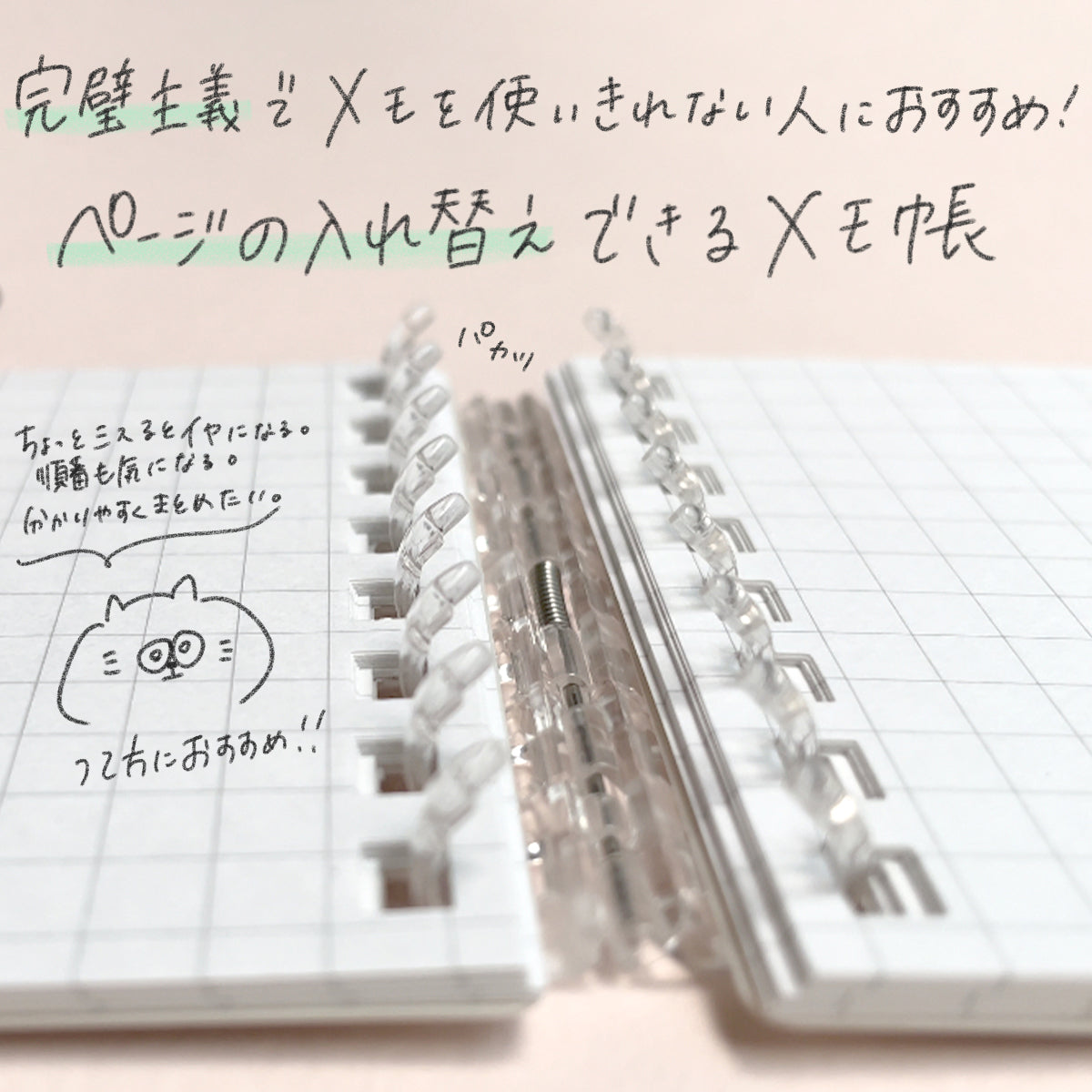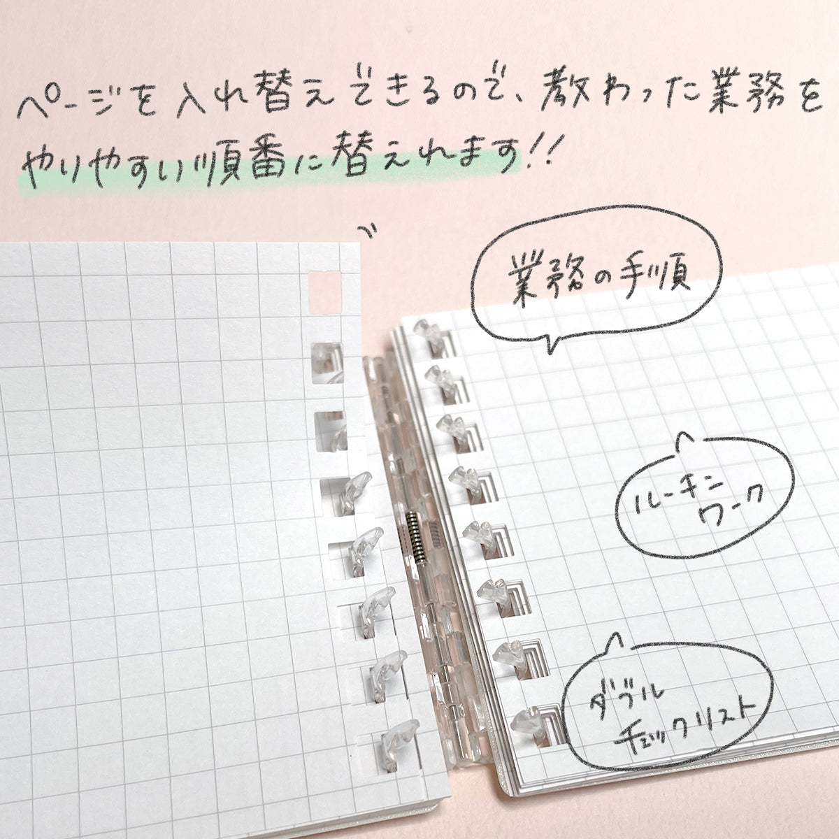 内容別にページを選んでメモしていた頃は、聞き逃しや誤字脱字が多かったのですが、このメモ帳は後からページを入れ替えられるので、話が切り替わったタイミングでペラっと一枚めくるだけで解決。後で並び変える他、2冊持ちして「書く用」「保存用」で中身の引越しも簡単。情報共有も6枚(2×3)並べてA4用紙にコピーするだけで良いので私は楽でした。