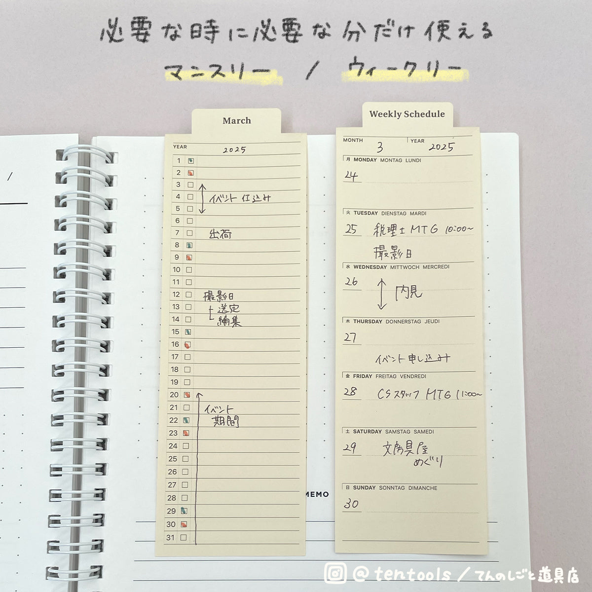 追加があればブックマーカーに書き込み、後から、通常のマンスリーにも追加記入しています。