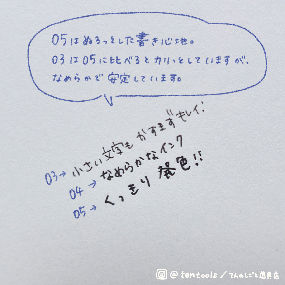 0.5mmはぬるっとした滑らかさ。0.3mmは0.5mmに比較するとぬる感は少なめですが、この極細タイプの中ではかなり滑らかな書き心地です。