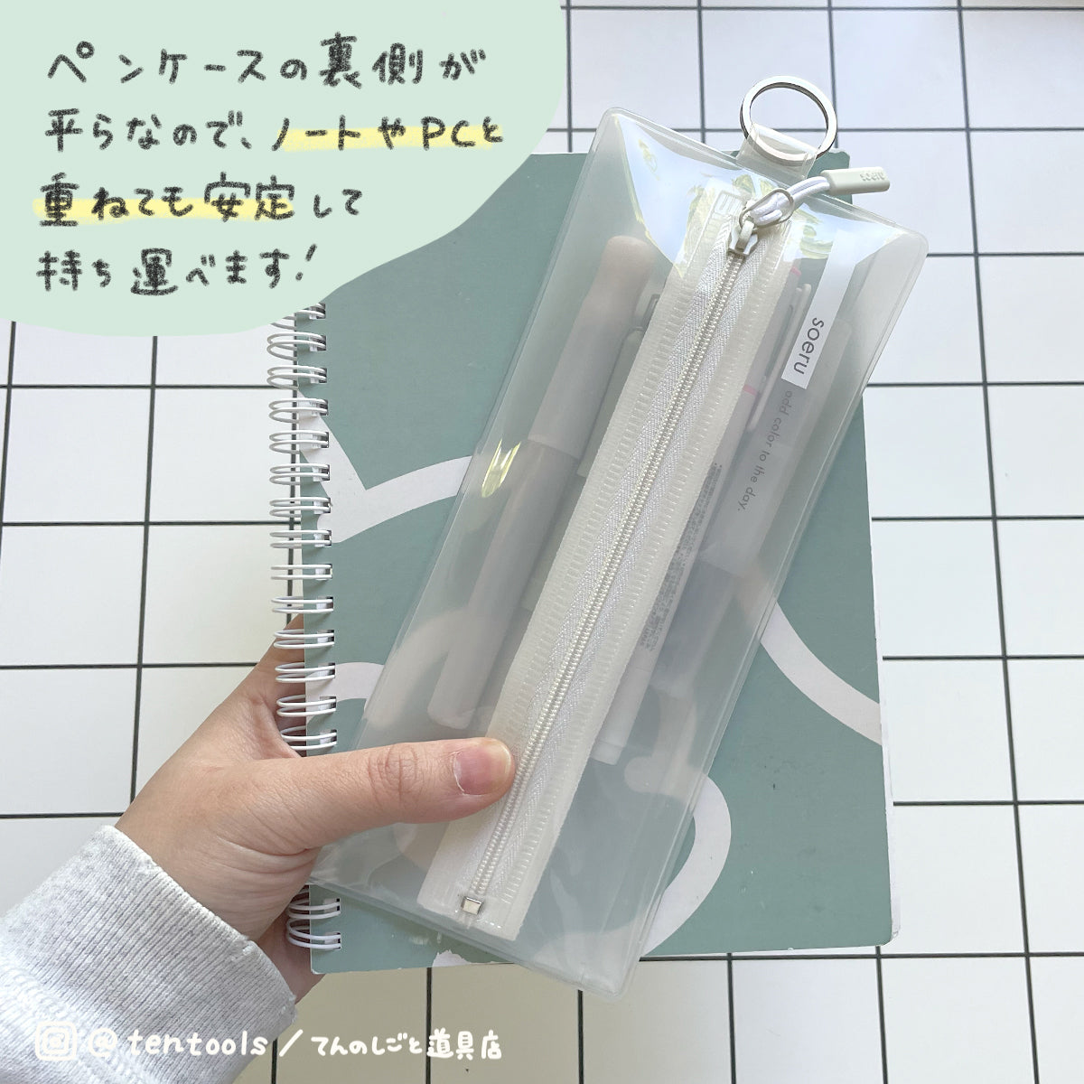 フラットタイプのペンケースなので、ノートやパソコンと重ねて一緒に持ち歩く時も安定しています。