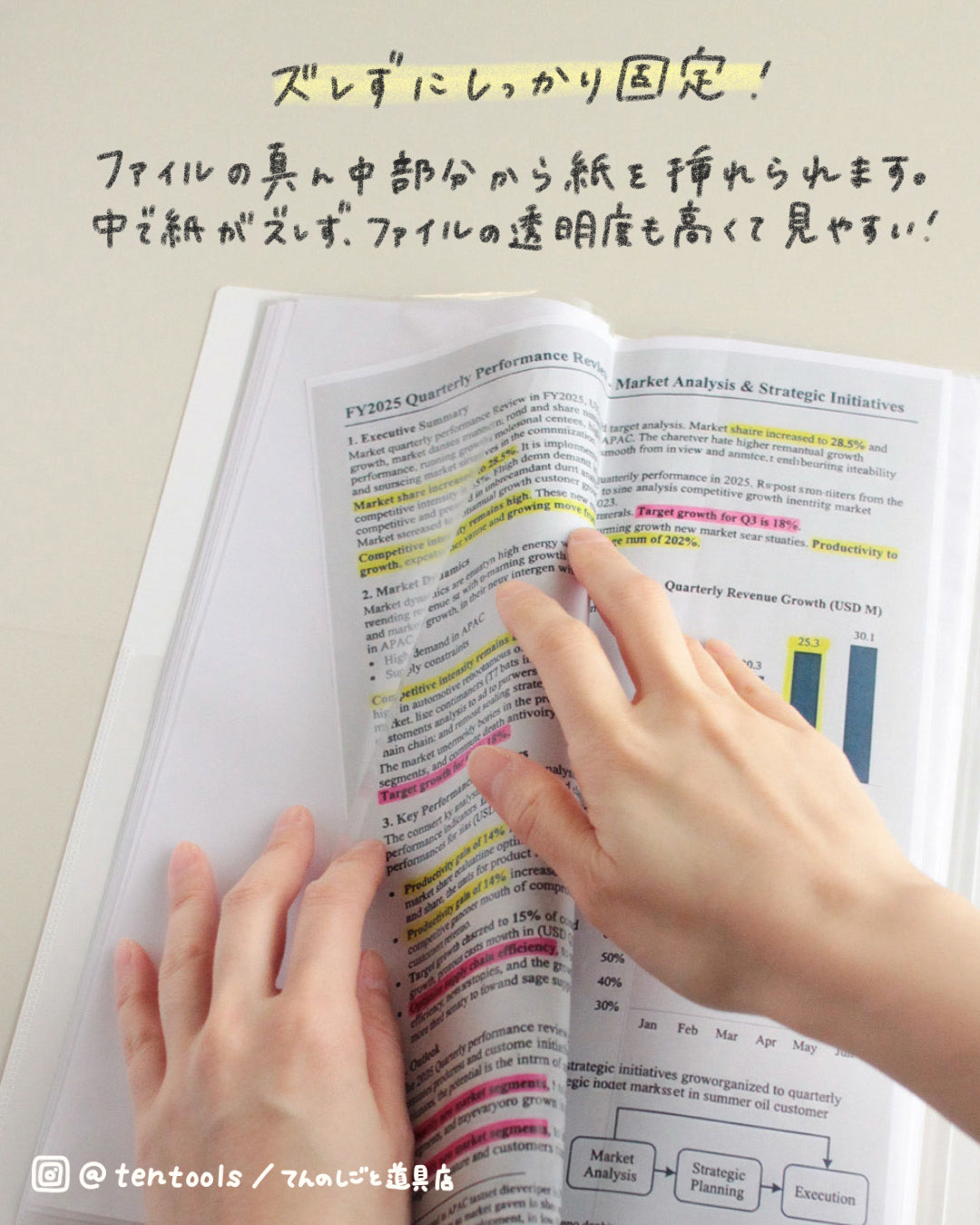 ファイルの真ん中部分の切れ目からA4用紙を挿れることができます。サイズはぴったりなので少し挿れにくさを感じるかもしれませんが、紙がファイルの中でズレたりしないので読みやすいです。