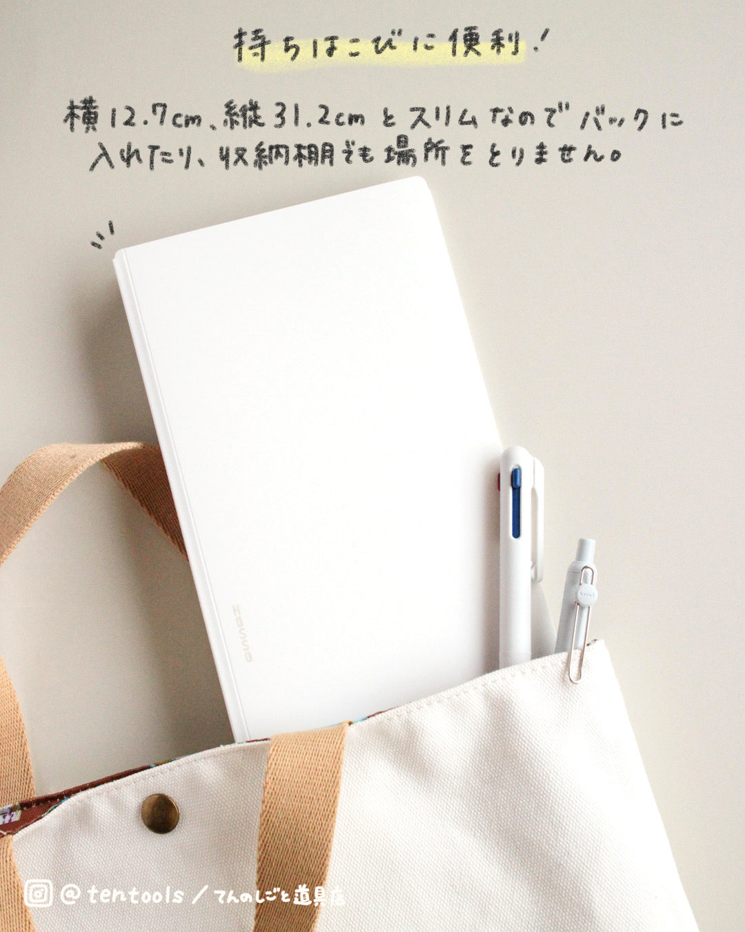 A4サイズを縦に半分に折ったサイズ感で持ち運べるので、多くのバッグにいれて持ち運ぶことができます。
