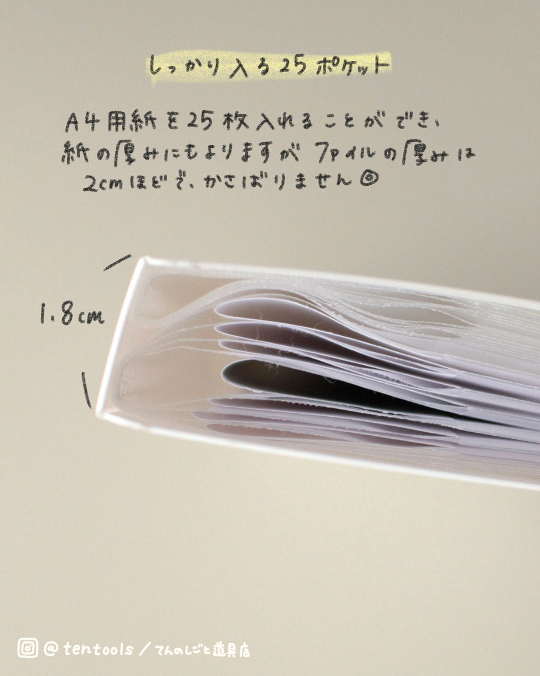 ポケットは25枚ついています。収納する紙の厚さにも左右されますが、ファイル自体のマチは約2cm。バッグにいれても、収納棚においてもかさばりにくいサイズ感です。