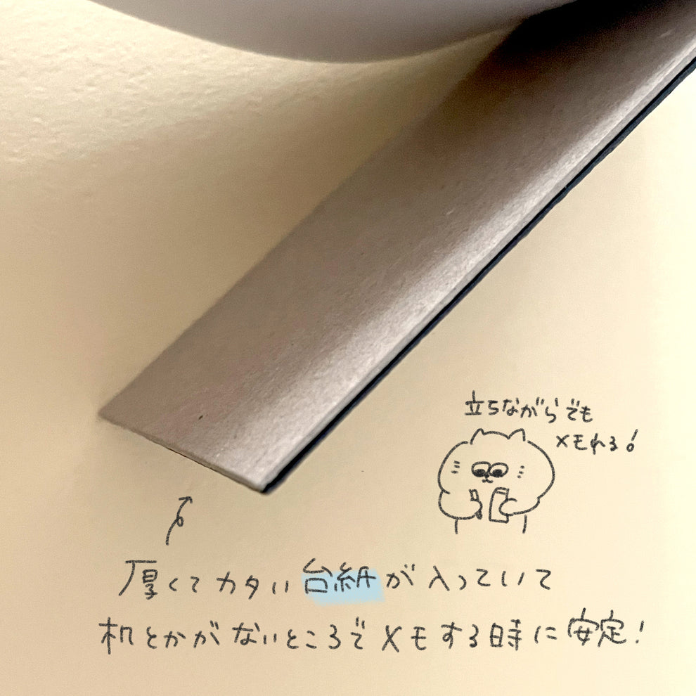 厚口ボール紙を台紙にしてあるため、手に持っての筆記が非常にしやすく、書く場所を選ばない。