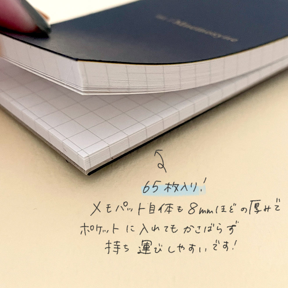 65ページ入り!メモパッド自体も8mmほどの厚みでポケットに入れも嵩張らず持ち運びしやすいです。