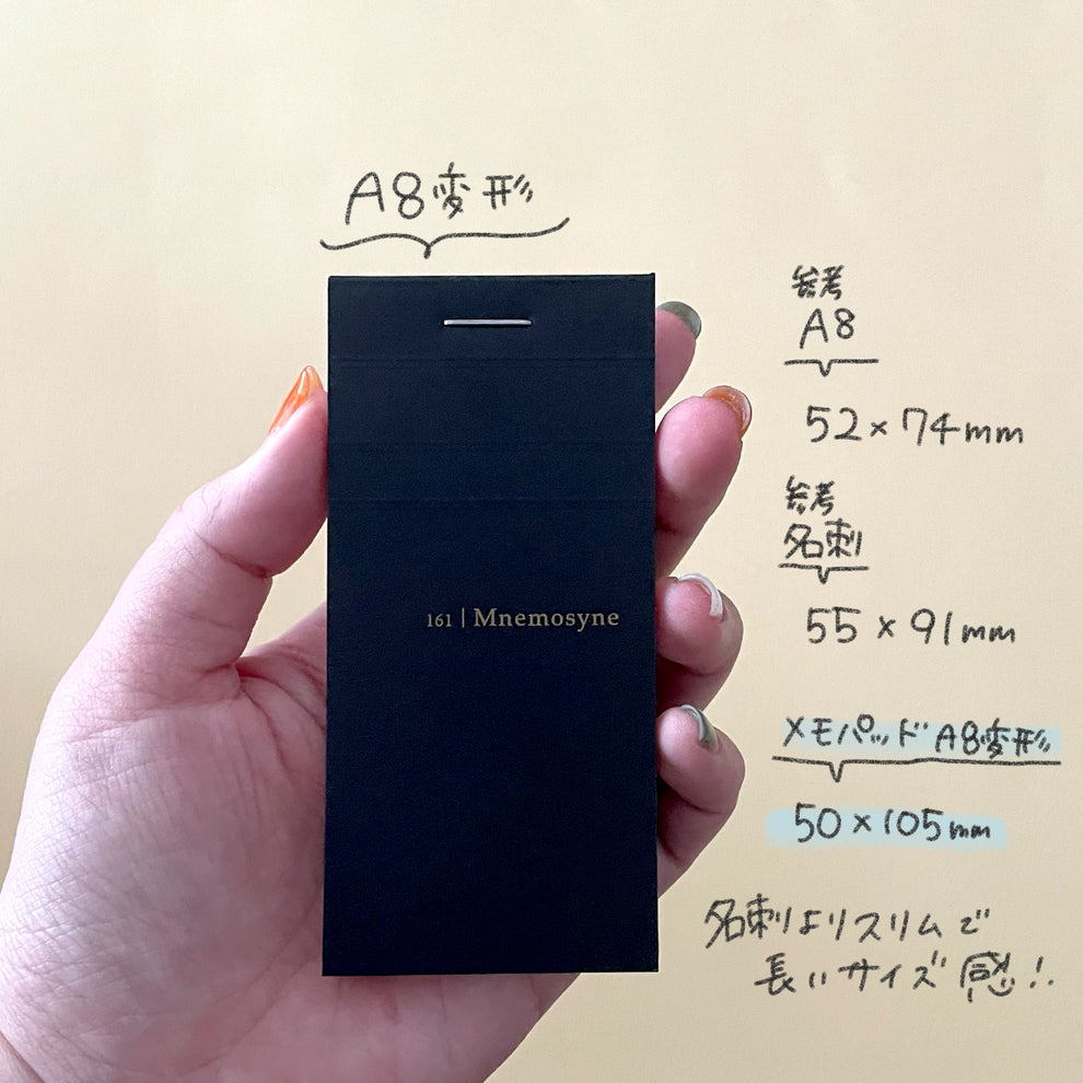 A8サイズ(変形)と非常に小さなサイズのメモパッドで、どのように携帯していても邪魔にならず取り出しもスムーズ。