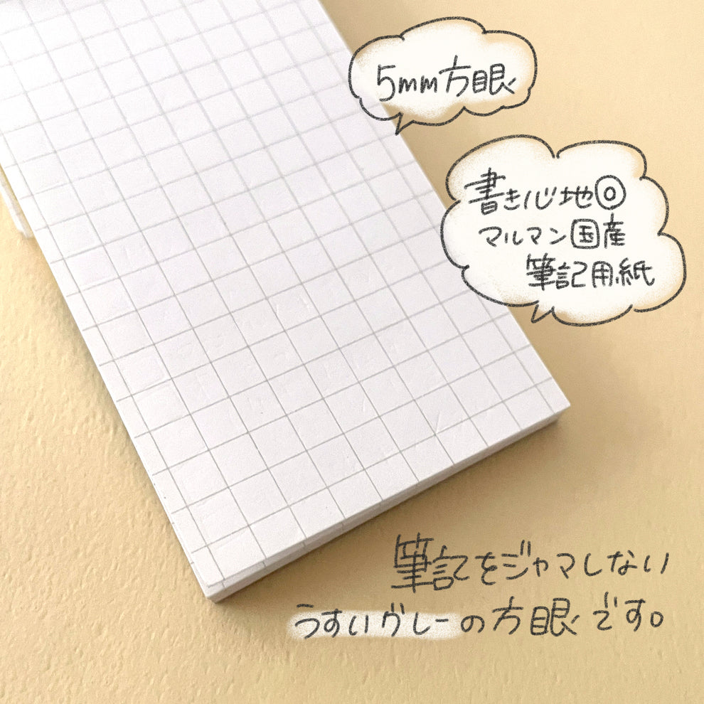 程よい厚さと、心地よい書き味が定評のマルマン国産筆記用紙を使用。5mm方眼罫。