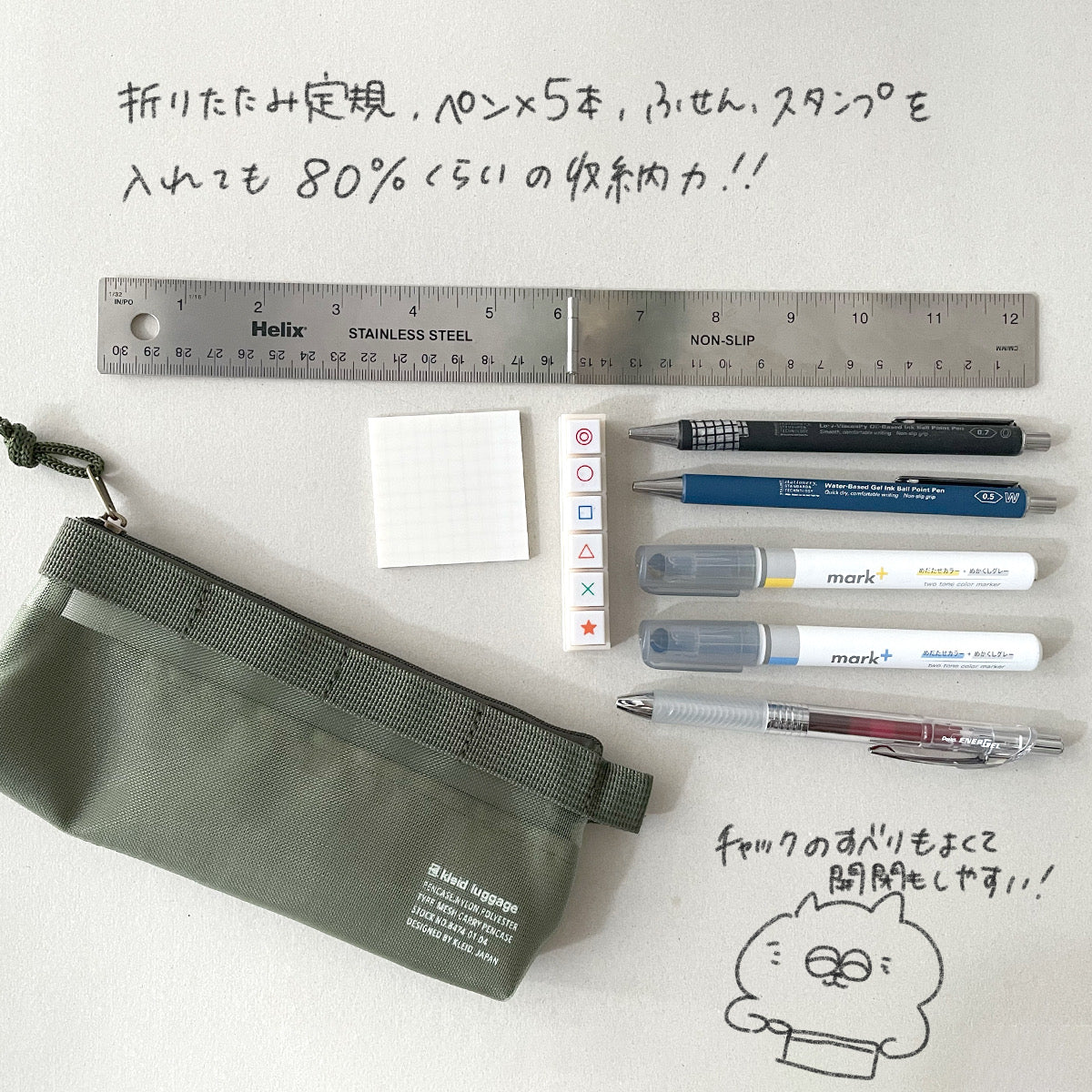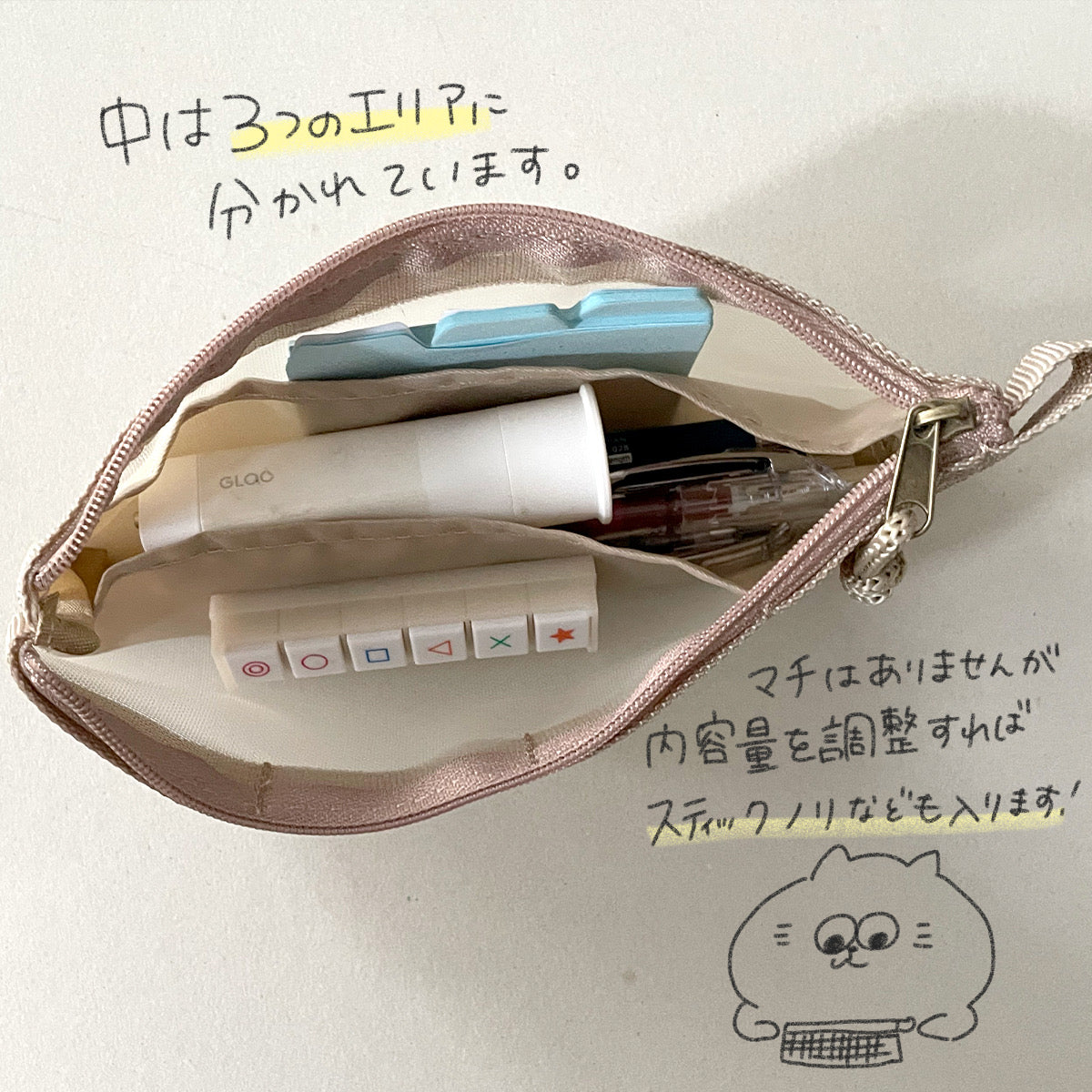 マチがないタイプなので収納力が心配だったんですが、メッシュが中のものに合わせて形を変えてくれるのでスティックノリなどのかさばるものも入れることができます。