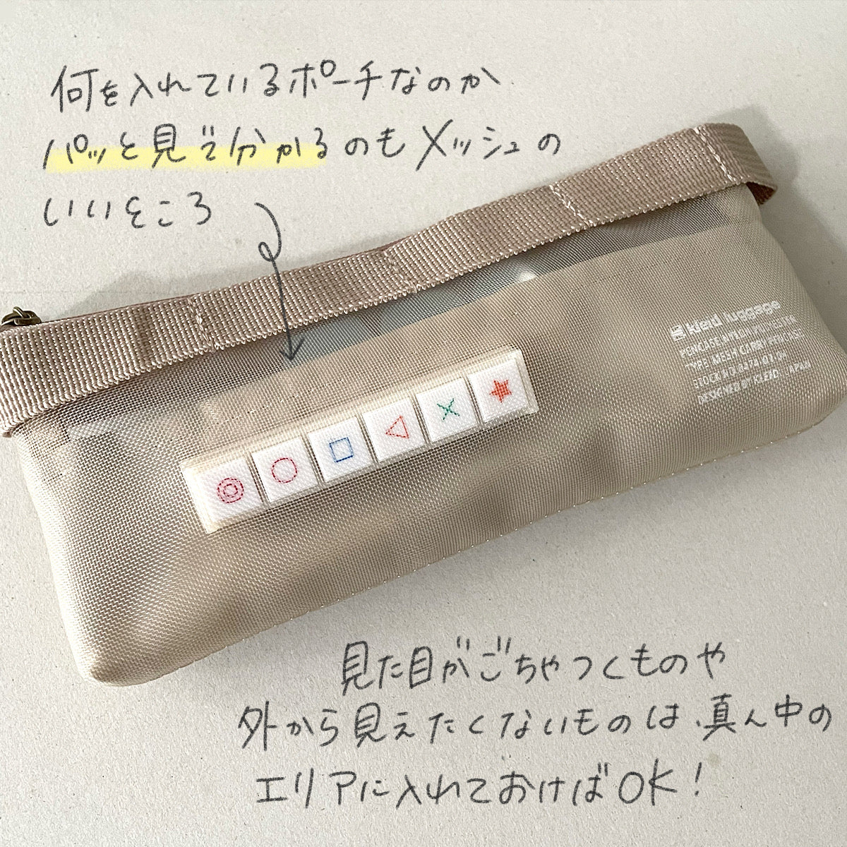 メッシュポーチって、わざわざポーチを開けなくても中のものが見えるのがいいところ!