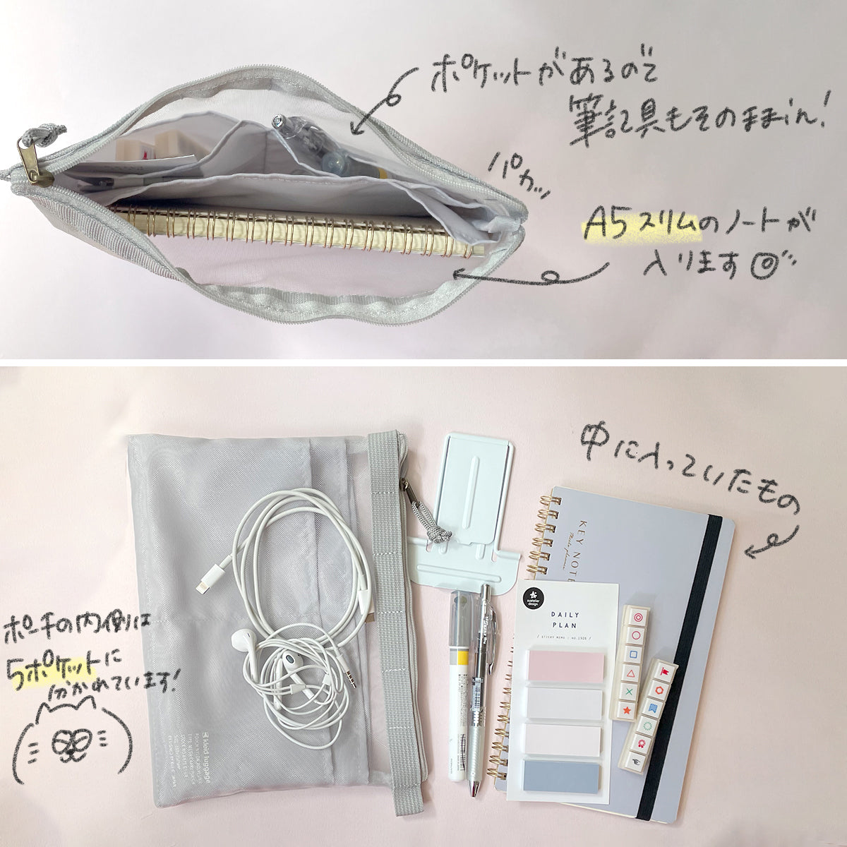 ただ、こまごまとした物も収納できるので、ペンとノート以上にいろいろ入れたくなってしまう!