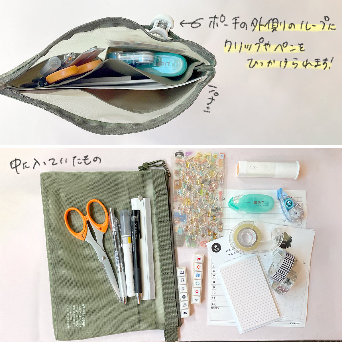 手帳で使う筆記具やシールなどをひとまとめにしています。とても便利でお気に入りです。