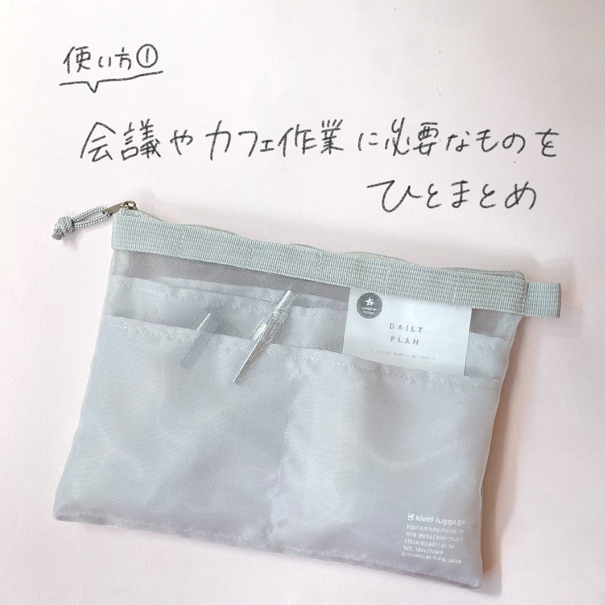 見せたいものをメッシュ(外側)に、見せたくないものをポケット(内側)に使い分けて収納可能。