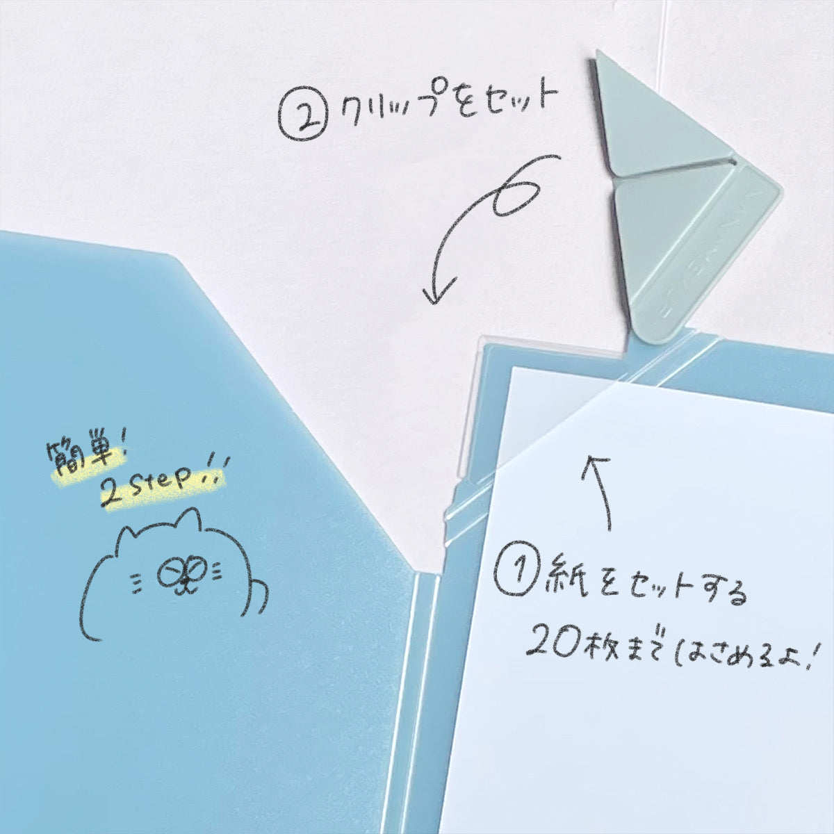 三角形のパーツをスライドすると、紙をセットできるファイルの角があるので、そこにセット。