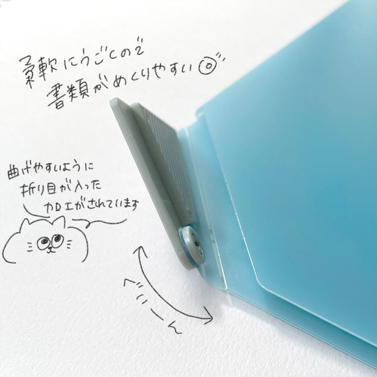 ホチキス留めの感覚で、書類をナナメにめくれます。ファイルに入れたまま閲覧・記入・押印できて便利!