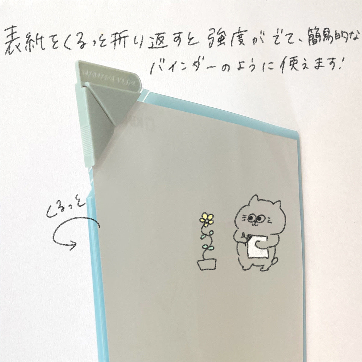 表紙カバーはくるっと折り返すことができます。折り返すと少しだけ強度がでるので簡易的なバインダーとしても使えます。