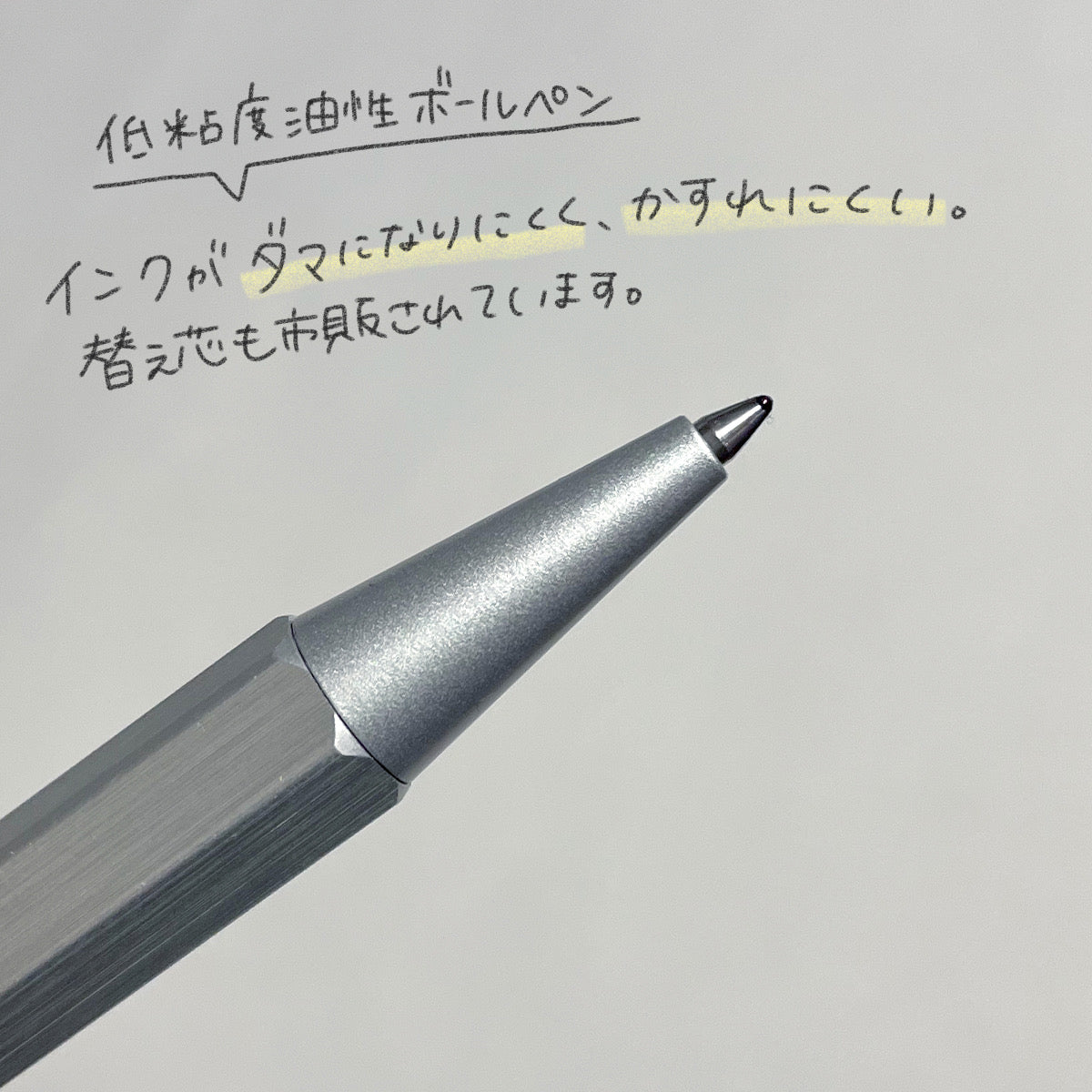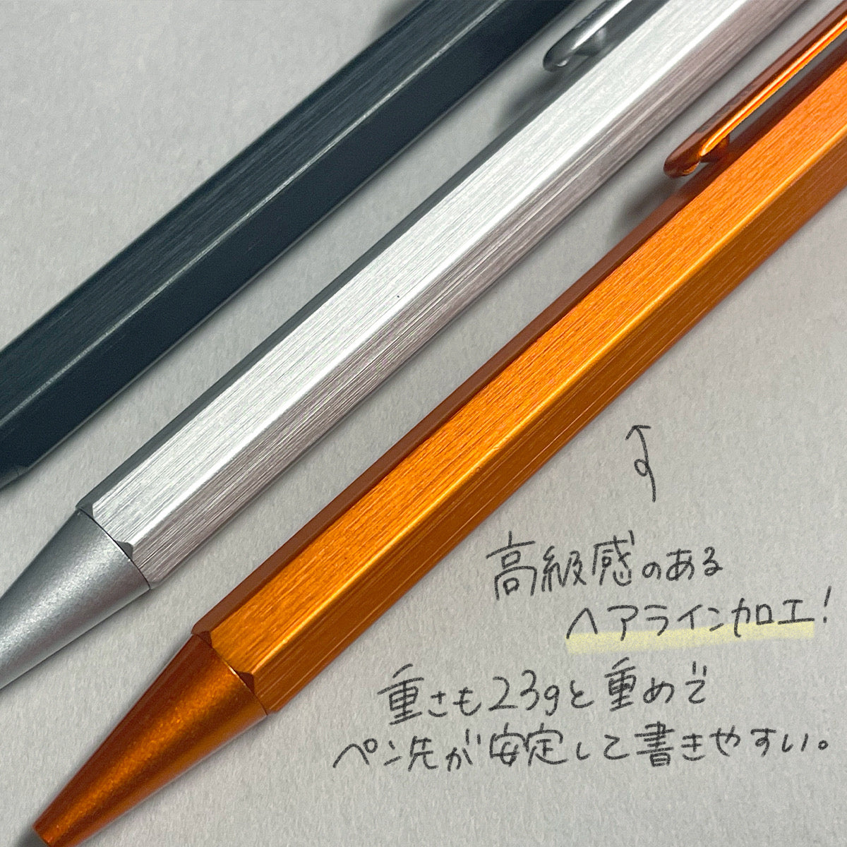 アルミニウム素材を採用した六角形軸はヘアライン加工で仕上げられ、金属のグレード感を楽しめるだけでなく、手触りにも優れます。